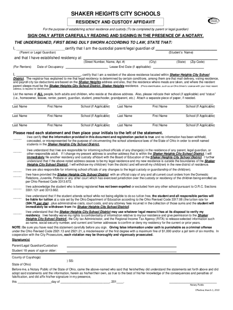 Anyone who needs to establish residency or custody for legal purposes may need to fill out the www.shaker.org/downloads/newresidency affidavit.