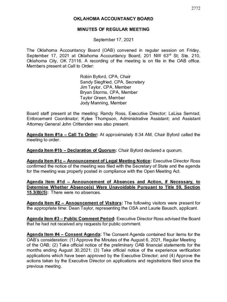 2772 OKLAHOMA ACCOUNTANCY BOARD MINUTES OF REGULAR MEETING September 17, 2021, The Oklahoma Accountancy Board (OAB) convened in regular session on Friday, September 17, 2021, at Oklahoma Accountancy