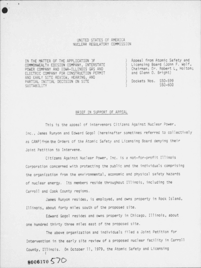 Get the free Brief in form of pleading in support of appeal from ASLB 800530 order denying petiti...