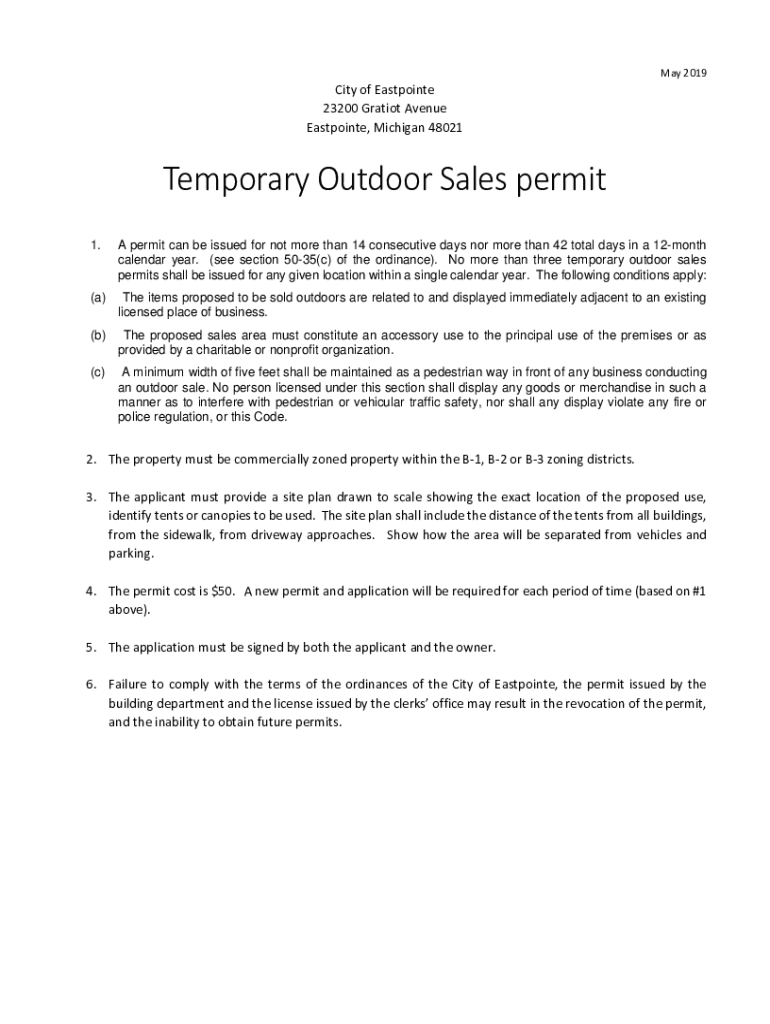 May 2019City of Eastpointe 23200 Ratio Avenue Eastpointe, Michigan 48021Temporary Outdoor Sales permit 1. A permit can be issued for not more than 14 consecutive days nor more than 42 total days in