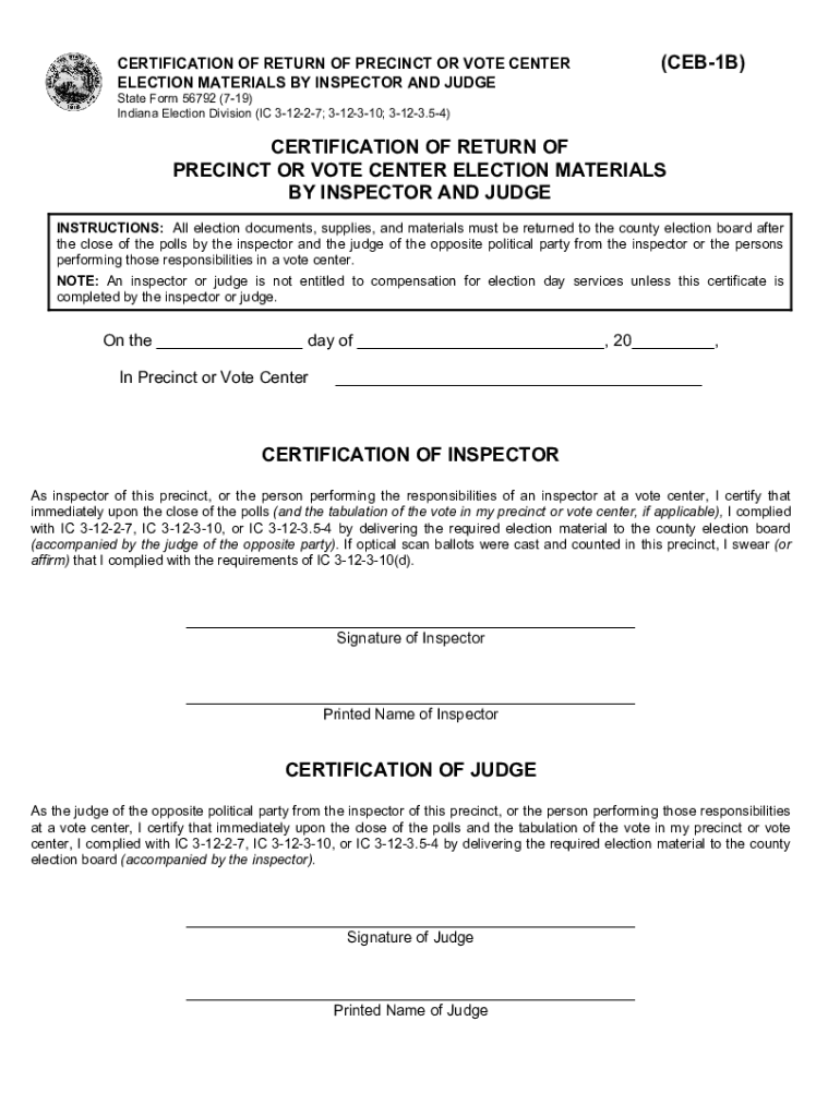 Reset Recertification OF RETURN OF PRECINCT OR VOTE CENTER ELECTION MATERIALS BY INSPECTOR AND JUDGE(CEB1B)State Form 56792 (719) Indiana Election Division (IC 31227; 312310; 3123.54)CERTIFICATION