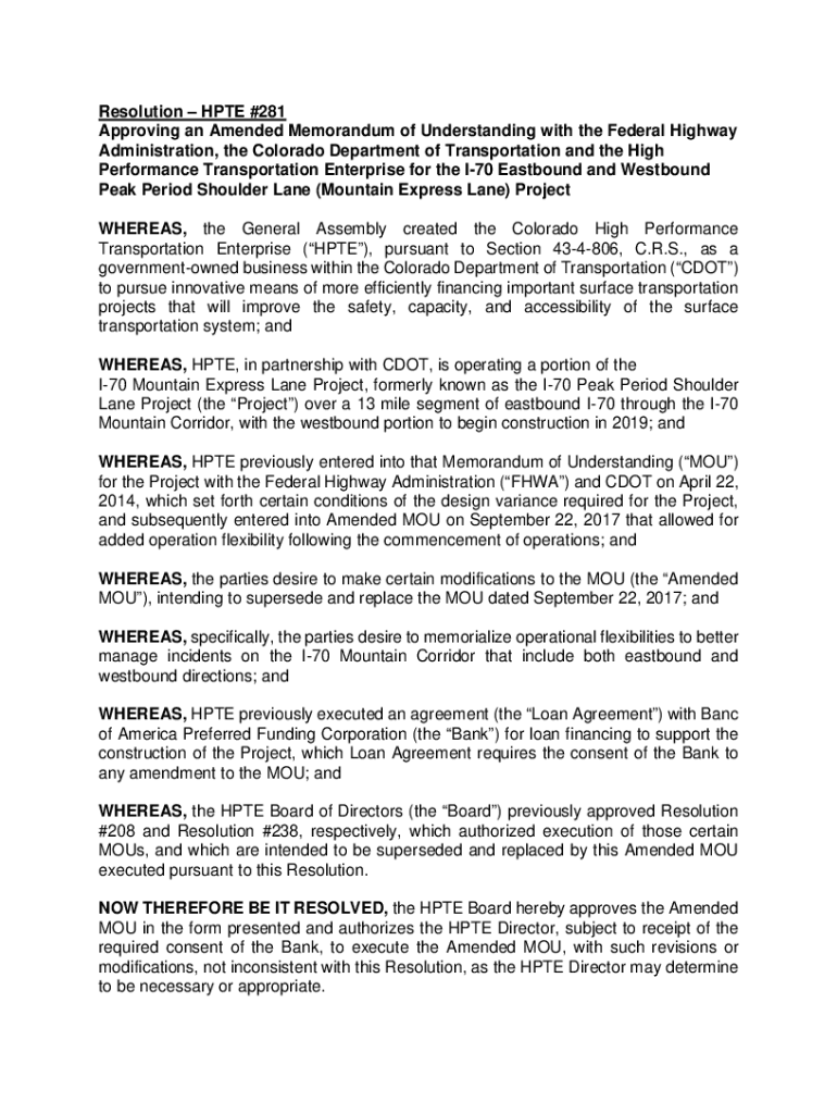 Resolution HATE #281 Approving an Amended Memorandum of Understanding with the Federal Highway Administration, the Colorado Department of Transportation and the High Performance Transportation Enterprise