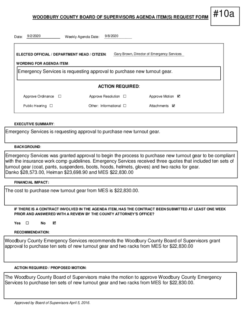 WOODBURY COUNTY BOARD OF SUPERVISORS AGENDA ITEM(S) REQUEST Format:9/2/2020 ___Weekly Agenda Date:#10a9/8/2020 ___ELECTED OFFICIAL / DEPARTMENT HEAD / CITIZEN:Gary Brown, Director of Emergency Services