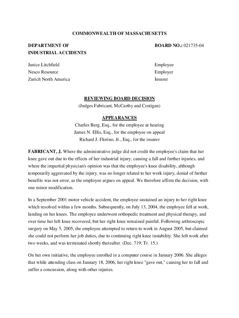 COMMONWEALTH OF MASSACHUSETTS DEPARTMENT ONBOARD NO.: 02173504INDUSTRIAL ACCIDENTS Janice Litchfield UNESCO Resource Zurich North AmericaEmployee Employer InsurerREVIEWING BOARD DECISION (Judges Fabric