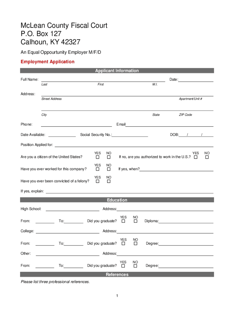 McLean County Fiscal Court P.O. Box 127 Calhoun, KY 42327 An Equal Opportunity Employer M/F/D Employment Application Applicant Information Full Name:Date: LastFirstM. I. Address: Street AddressApartment/Unit