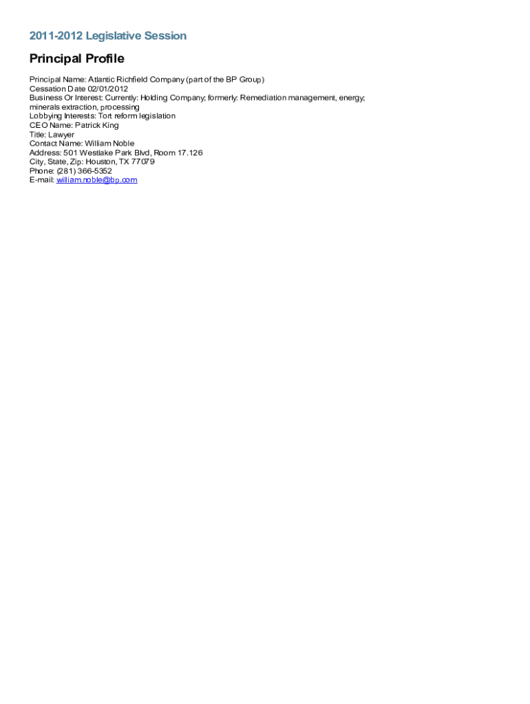20112012 Legislative SessionPrincipal Profile Principal Name: Atlantic Rich field Company (part of the BP Group) Cessation Date 02/01/2012 Business Or Interest: Currently: Holding Company; formerly: