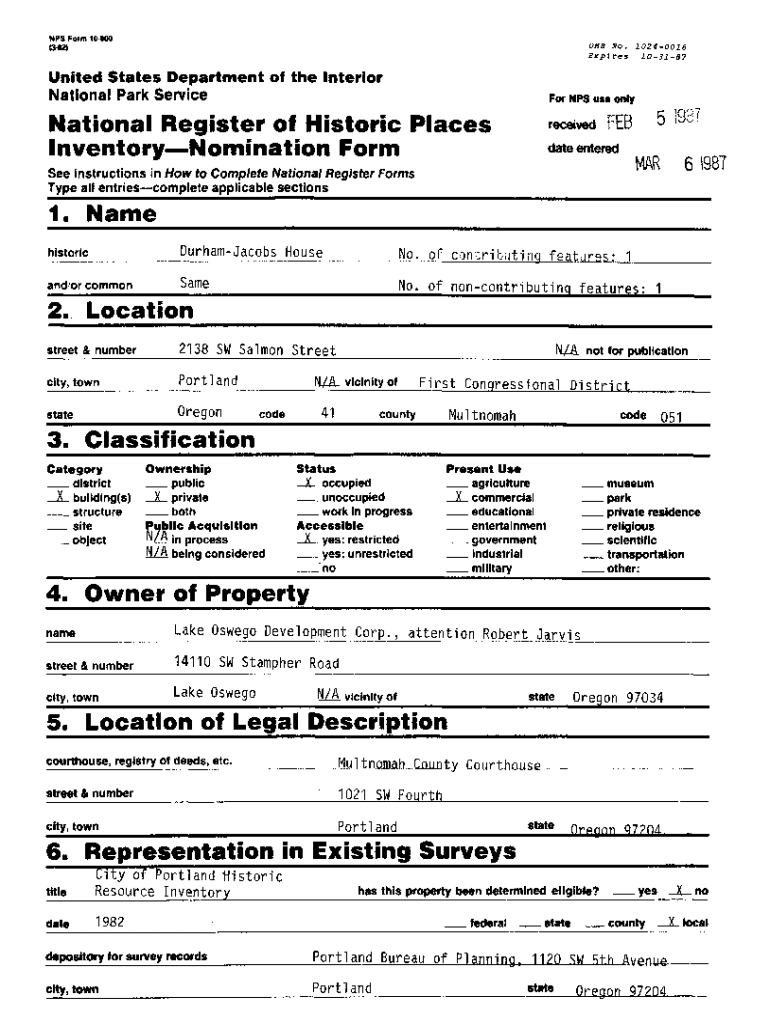 NPS Form 10900 (382)OMB No. 10240018 Expires 103187United States Department of the International Park ServiceNow NPS use onlyNational Register of Historic Places InventoryNomination Form received