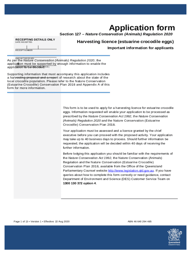 Instructions for the NCS/2018/4427 Application - Commercial wildlife harvesting licence (estuarine crocodile eggs). This application is to to be used for commercial harvesting of protected wildlife not including macropods form
