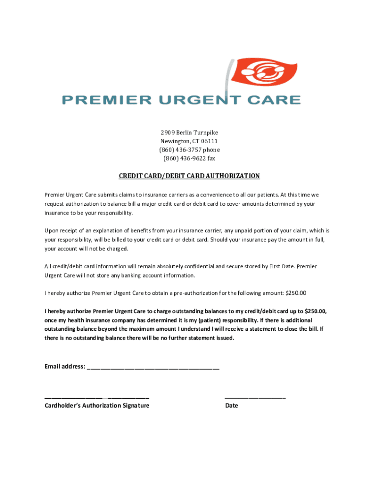 2909BerlinTurnpike Newington,CT06111 (860)4363757phone (860)4369622faxCREDITCARD/DEBITCARDAUTHORIZATION PremierUrgentCaresubmitsclaimstoinsurancecarriersasaconveniencetoallourpatients. Atthistimewe