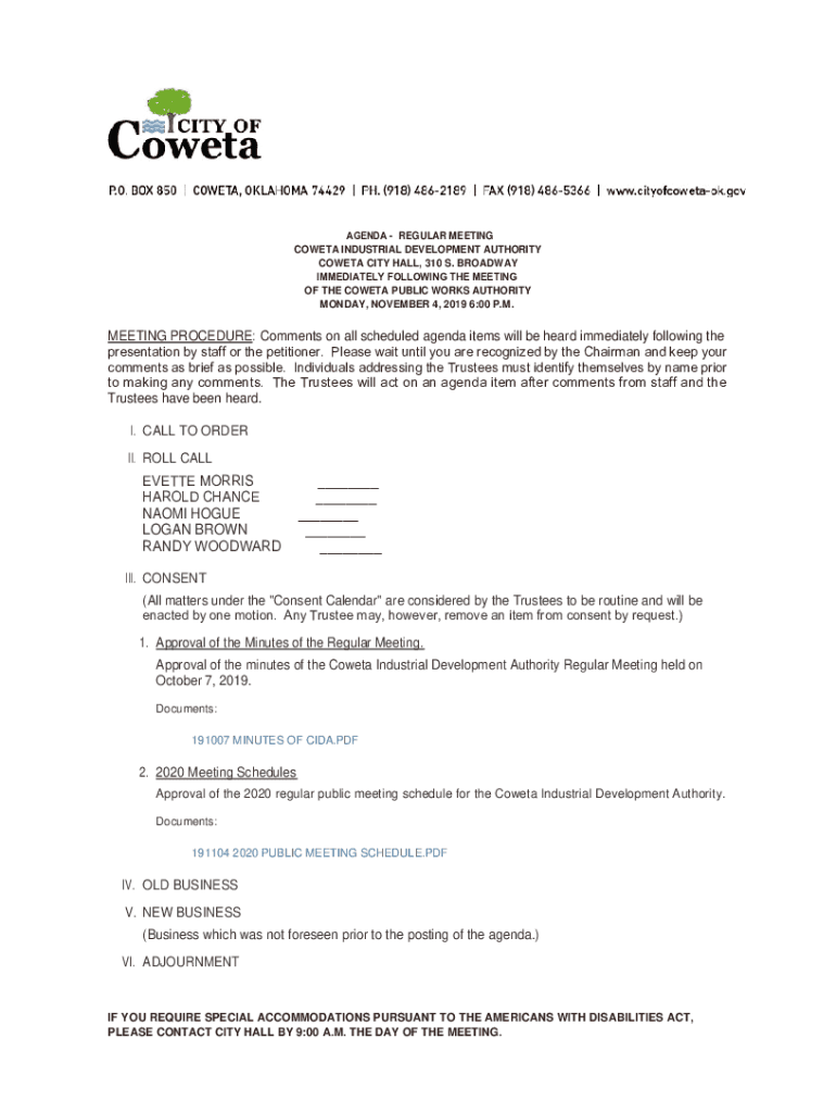 AGENDA REGULAR MEETING COMETA INDUSTRIAL DEVELOPMENT AUTHORITY COMETA CITY HALL, 310 S. BROADWAY IMMEDIATELY FOLLOWING THE MEETING OF THE COMETA PUBLIC WORKS AUTHORITY MONDAY, NOVEMBER 4, 2019 6:00