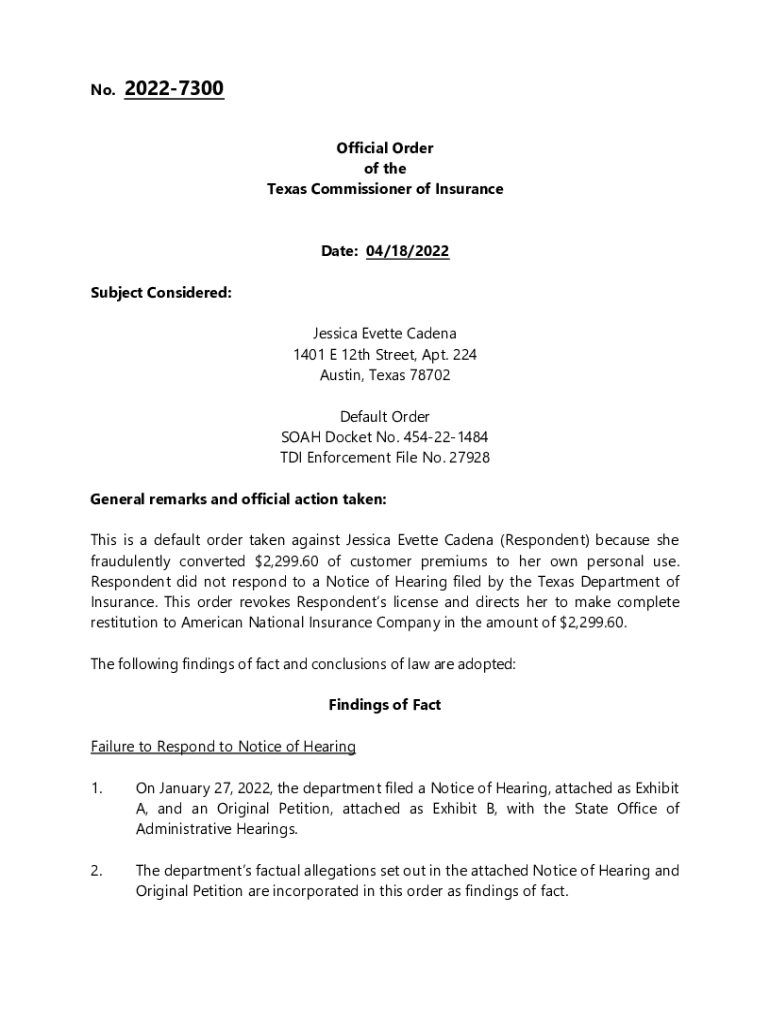 Get the free www.tdi.texas.govcommissionerdisciplinary27928 Cadena Default Order (No Answer) - Te...