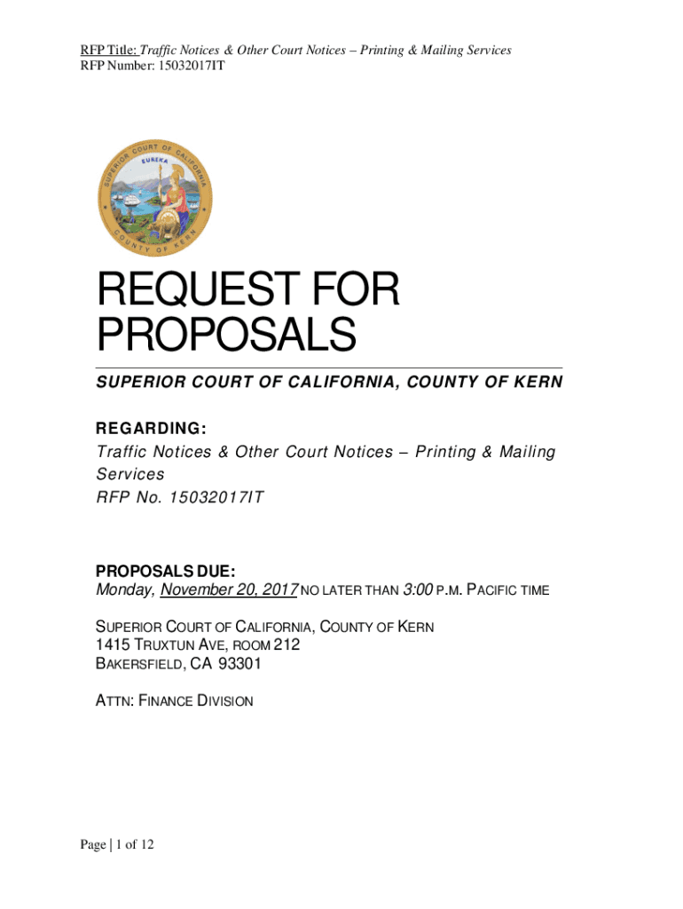 RFP Title: Traffic Notices & Other Court Notices Printing & Mailing Services RFP Number: 15032017ITREQUEST FOR PROPOSALS SUPERIOR COURT OF CALIFORNIA, COUNTY OF KERN REGARDING: Traffic Notices & Other