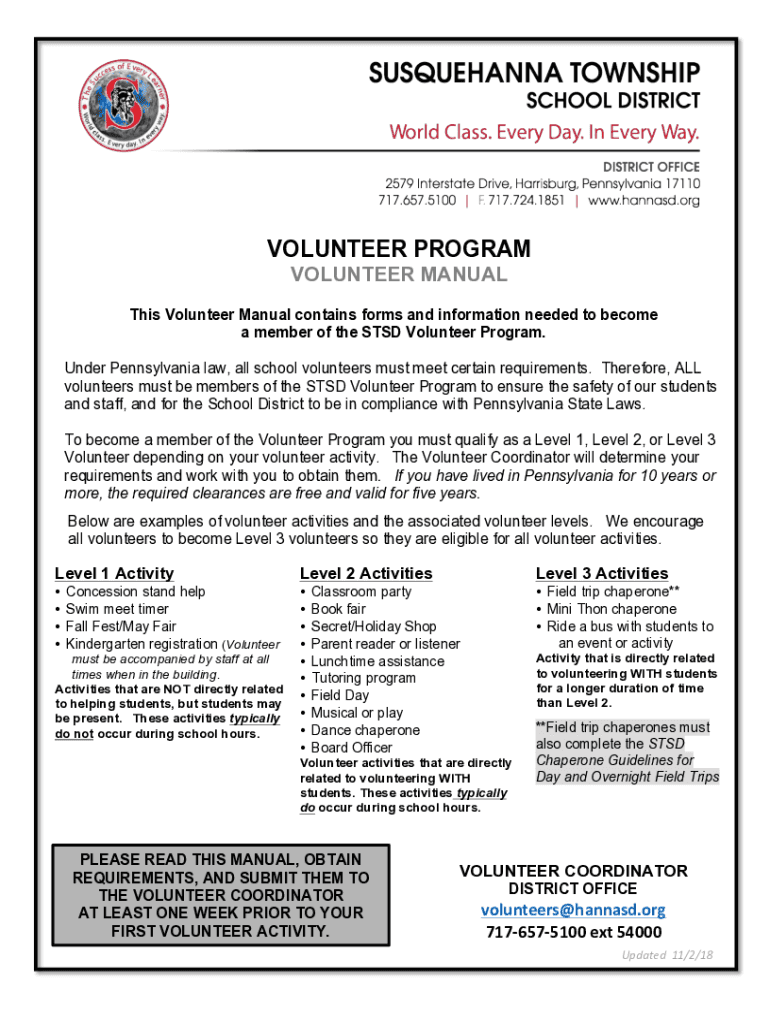 VOLUNTEER PROGRAM VOLUNTEER MANUAL This Volunteer Manual contains forms and information needed to become a member of the STD Volunteer Program. Under Pennsylvania law, all school volunteers must meet