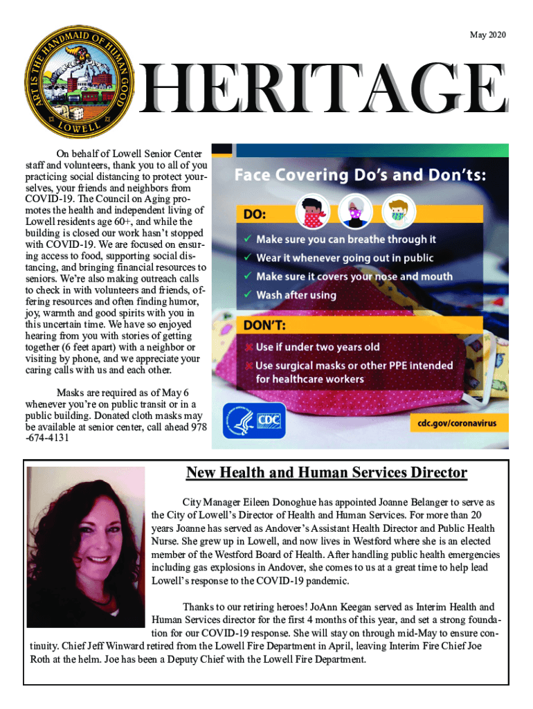1May 2020HERITAGE On behalf of Lowell Senior Center staff and volunteers, thank you to all of you practicing social distancing to protect yourselves, your friends and neighbors from COVID-19. The