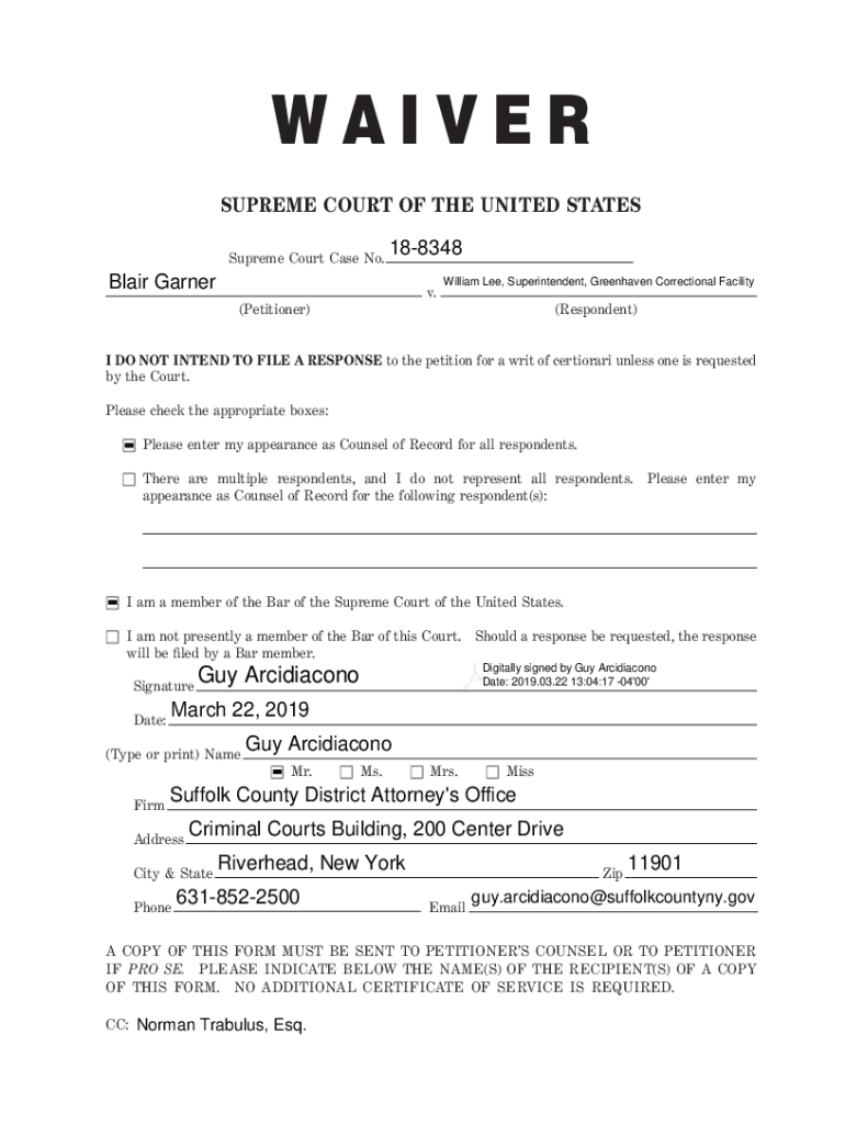 WAIVERSUPREME COURT OF THE United States Supreme Court Case No.188348Blair Garner. William Lee, Superintendent, Green haven Correctional Facility(Petitioner)(Respondent)I DO NOT INTEND TO FILE A RESPONSE