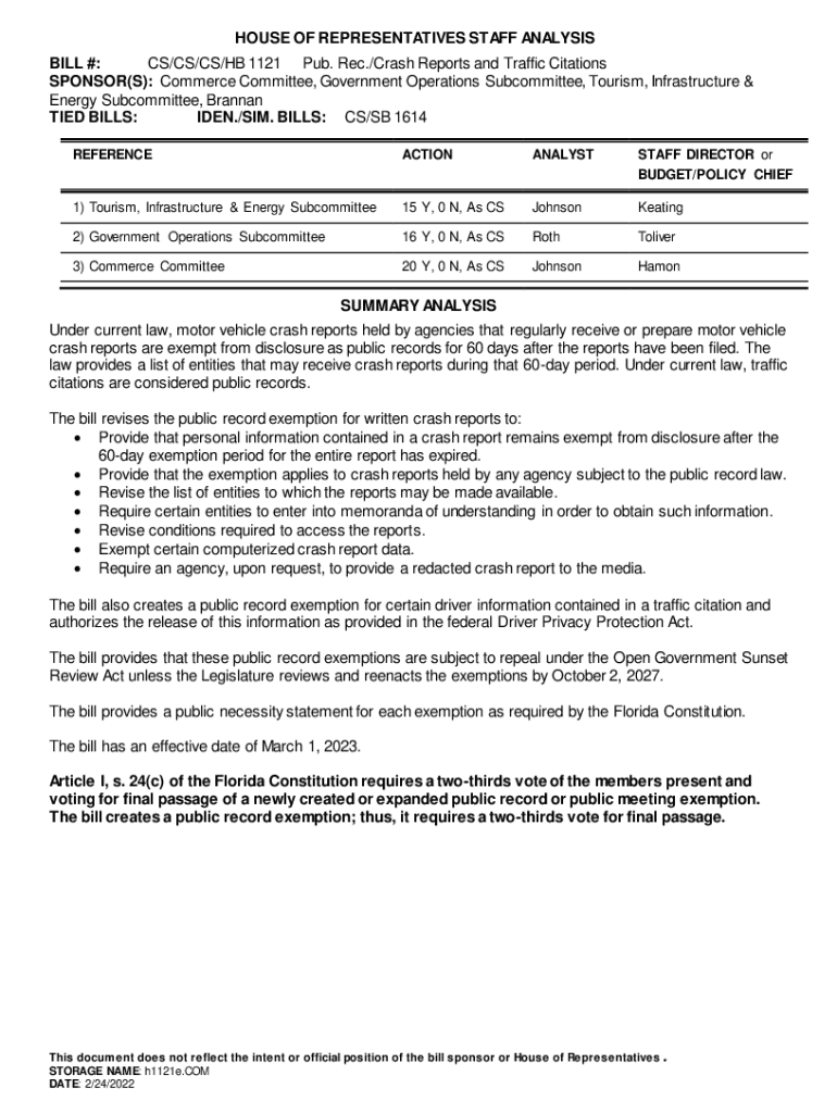 HOUSE OF REPRESENTATIVES STAFF ANALYSIS BILL #: CS/CS/CS/HE 1121 Pub. Rec./Crash Reports and Traffic Citations SPONSOR(S): Commerce Committee, Government Operations Subcommittee, Tourism, Infrastructure