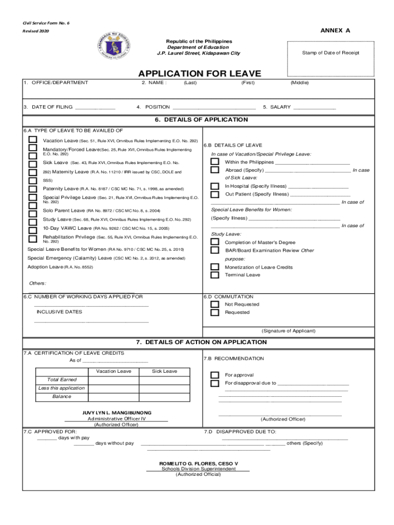 Civil Service Form No. 6ANNEX Revised 2020Republic of the Philippines Department of Education J.P. Laurel Street, Kidapawan Timestamp of Date of ReceiptAPPLICATION FOR LEAVE 1. OFFICE/DEPARTMENT2.