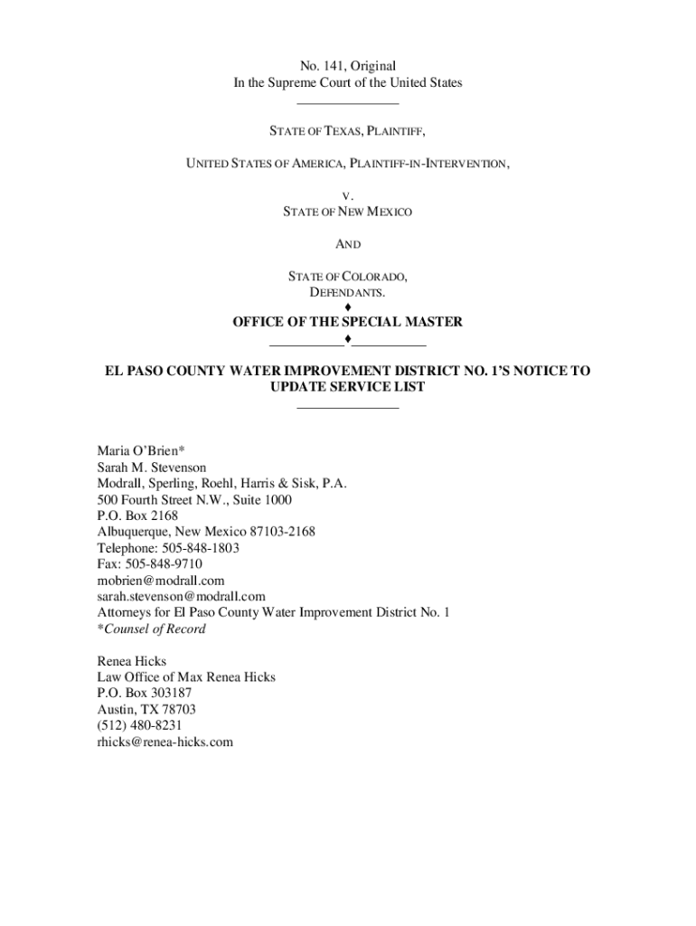 No. 141, Original In the Supreme Court of the United States ___ STATE OF TEXAS, PLAINTIFF, UNITED STATES OF AMERICA, PLAINTIFFININTERVENTION, V. STATE OF NEW MEXICAN STATE OF COLORADO, DEFENDANTS.