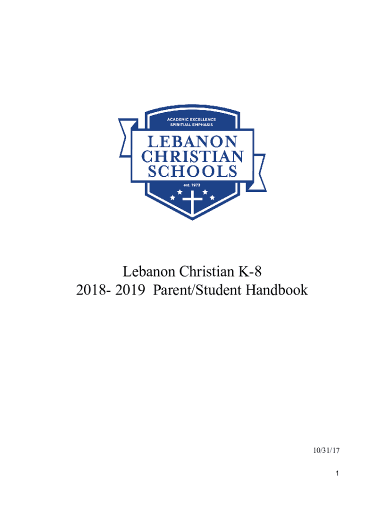 Lebanon Christian K8 2018 2019 Parent/Student Handbook10/31/17 1TABLE OF CONTENTS Lebanon Christian Schools Statement of Faith School Hours Policy of Nondiscrimination Statement of Marriage, Gender,