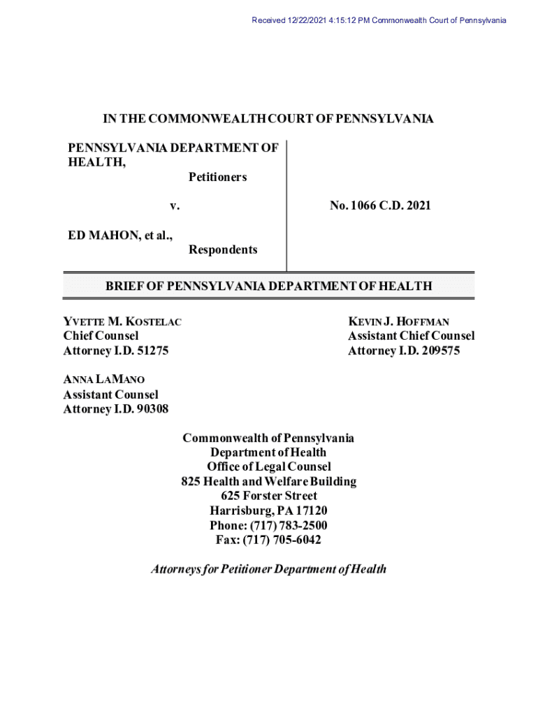 Received 12/22/2021 4:15:12 PM Commonwealth Court of Pennsylvanian THE COMMONWEALTH COURT OF PENNSYLVANIA DEPARTMENT OF HEALTH, Petitioners No. 1066 C.D. 2021v. ED MASON, et al., RespondentsBRIEF
