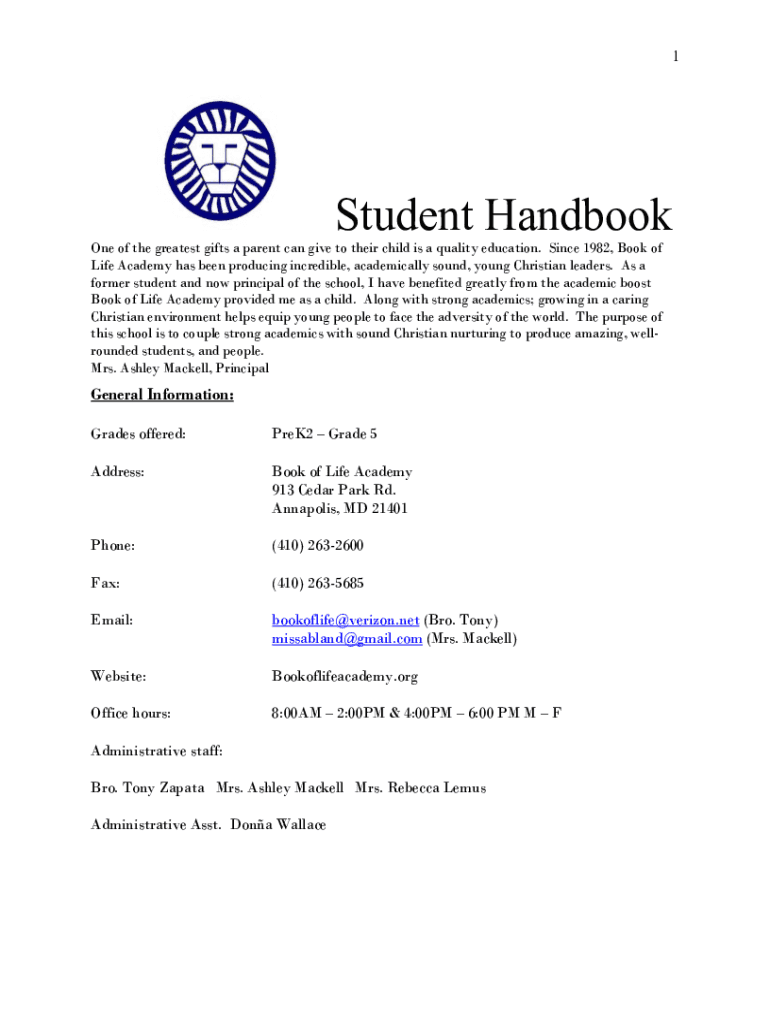 1Student Handbook of the greatest gifts a parent can give to their child is a quality education. Since 1982, Book of Life Academy has been producing incredible, academically sound, young Christian