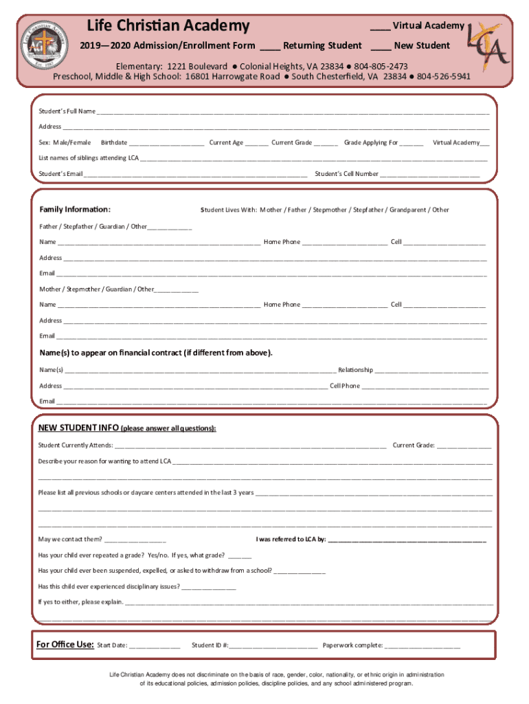 Life Christian Academy___ Virtual Academy20192020 Admission/Enrollment Form ___ Returning Student ___ New Student Elementary: 1221 Boulevard Colonial Heights, VA 23834 8048052473 Preschool, Middle