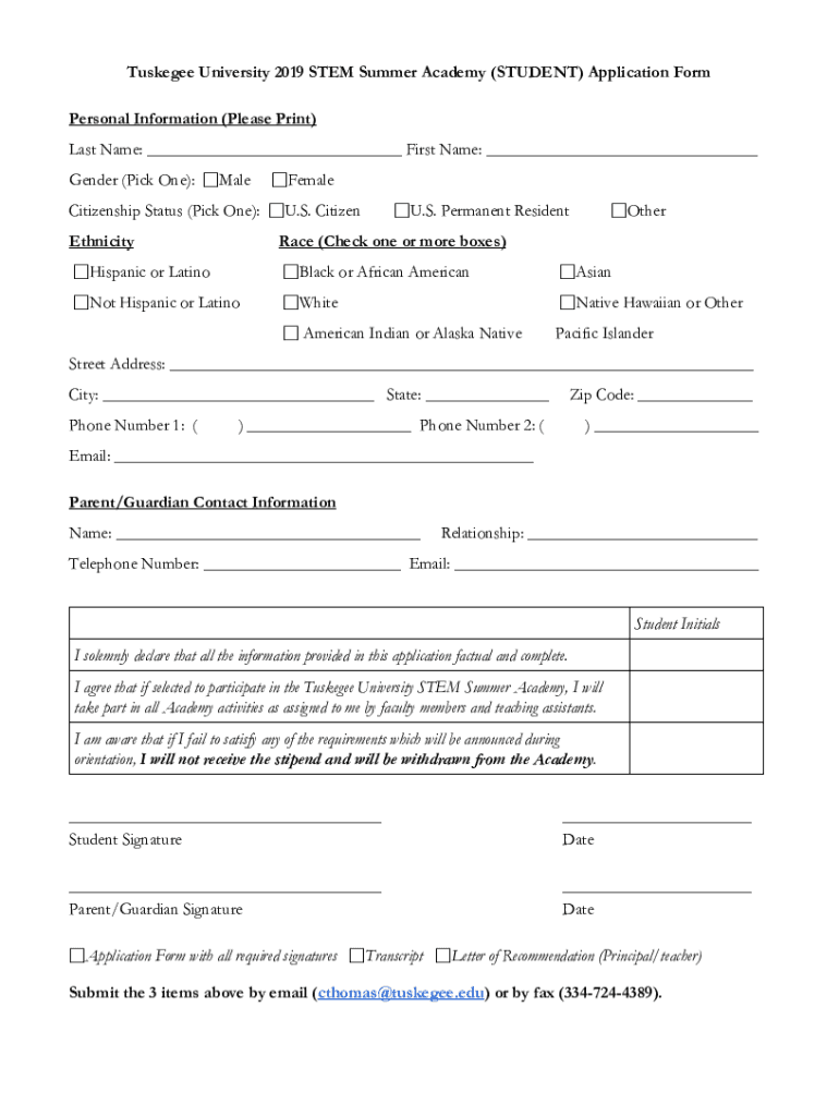 Tuskegee University 2019 STEM Summer Academy (STUDENT) Application Form Personal Information (Please Print) Last Name: ___ First Name: ___ Gender (Pick One): MaleFemaleCitizenship Status (Pick One):