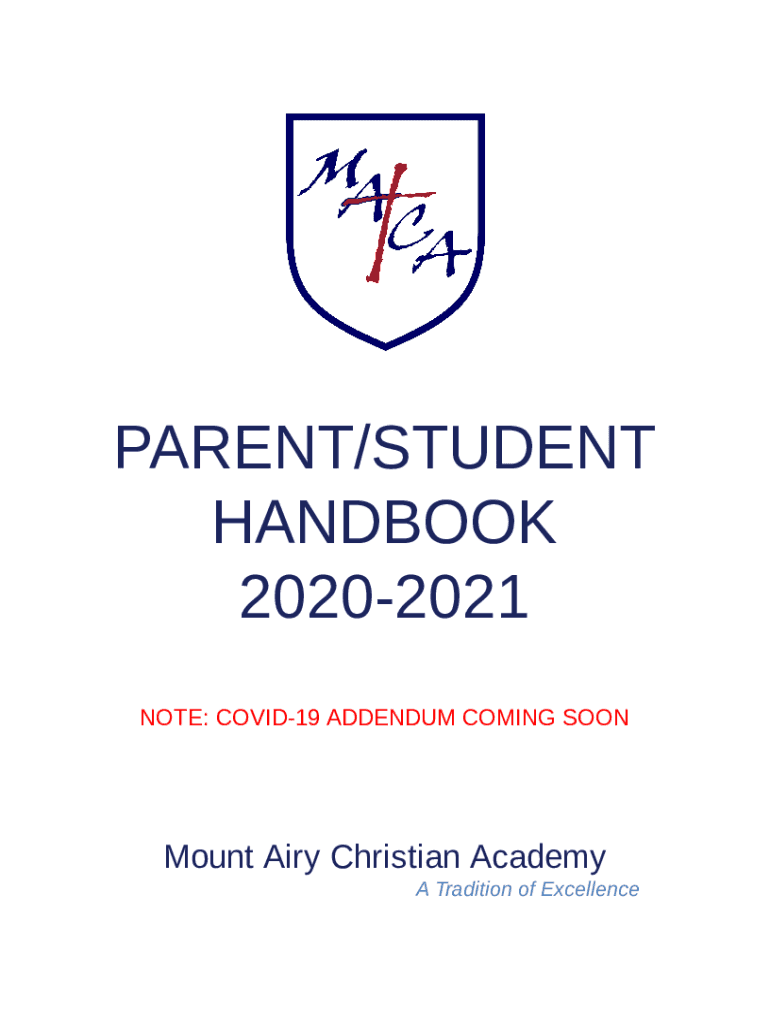 PARENT/STUDENT HANDBOOK 20202021 NOTE: COVID-19 ADDENDUM COMING SOON Mount Airy Christian Academy A Tradition of Excellence/MAC 202021 ParentStudent Handbook1Mount Airy Christian Academy is a member