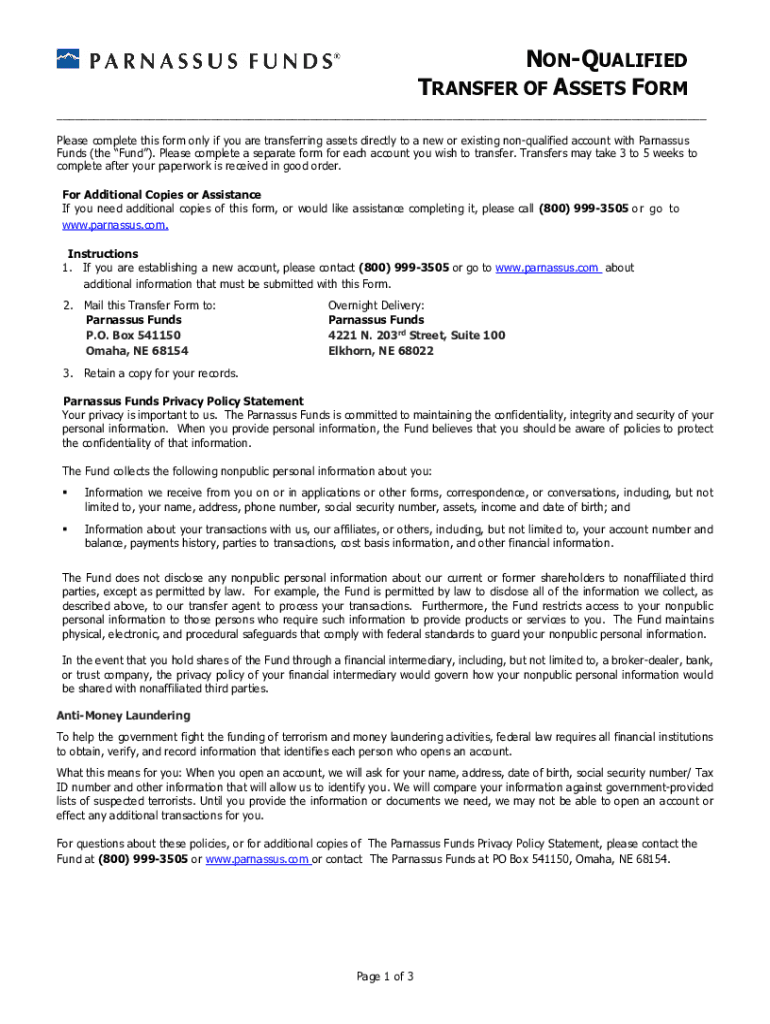 UNQUALIFIED TRANSFER OF ASSETS FORM ___ Please complete this form only if you are transferring assets directly to a new or existing nonqualified account with Parnassus Funds (the Fund). Please complete