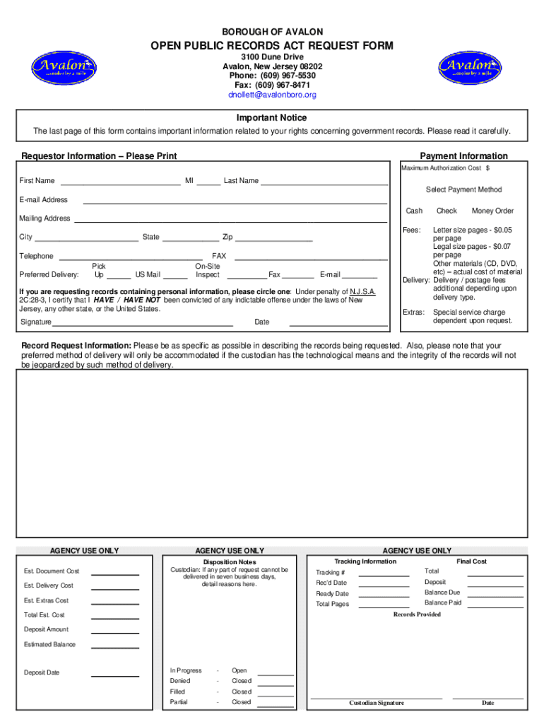 BOROUGH OF AVALONOPEN PUBLIC RECORDS ACT REQUEST FORM 3100 Dune Drive Avalon, New Jersey 08202 Phone: (609) 9675530 Fax: (609) 9678471 dnollett@avalonboro.orgImportant Notice The last page of this