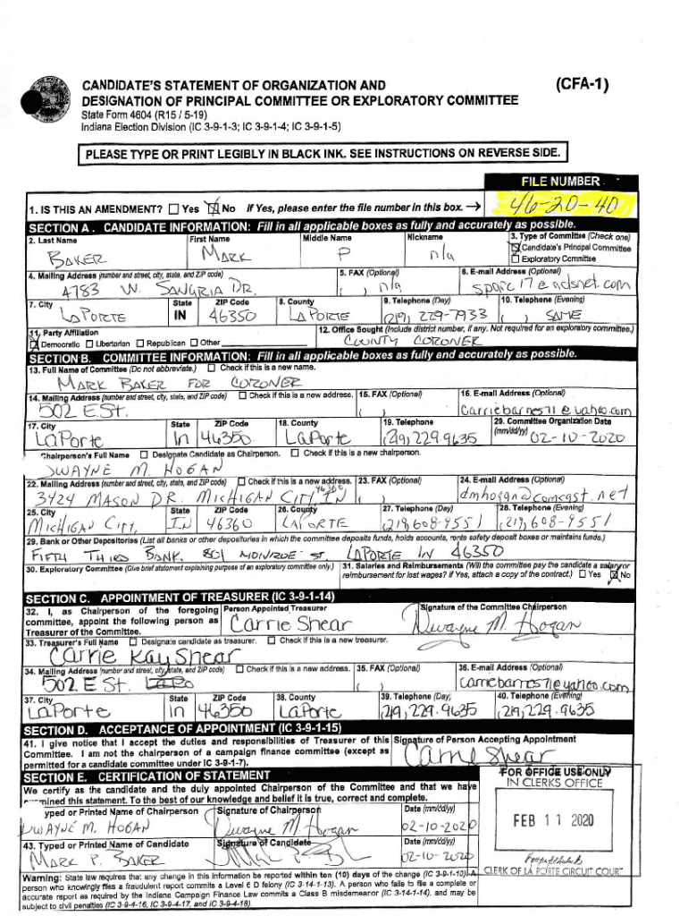 A \'a 4,7(CFA1)CANDIDATE\'S STATEMENT OF ORGANIZATION AND DESIGNATION OF PRINCIPAL COMMITTEE OR EXPLORATORY COMMITTEEState Form 4604 (R15 / 519) Indiana Election Division (IC 3913; IC 3914; IC 3915)