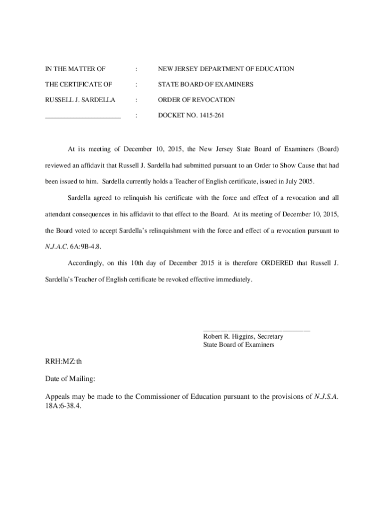 IN THE MATTER OF:NEW JERSEY DEPARTMENT OF EDUCATION CERTIFICATE OF:STATE BOARD OF EXAMINERSRUSSELL J. MARCELLA:ORDER OF REVOCATION___:DOCKET NO. 1415261At its meeting of December 10, 2015, the New