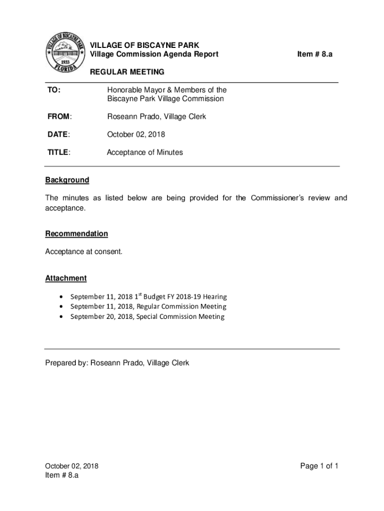Get the free VILLAGE OF BISCAYNE PARK Village Commission Agenda Report Item # 8.a ...
