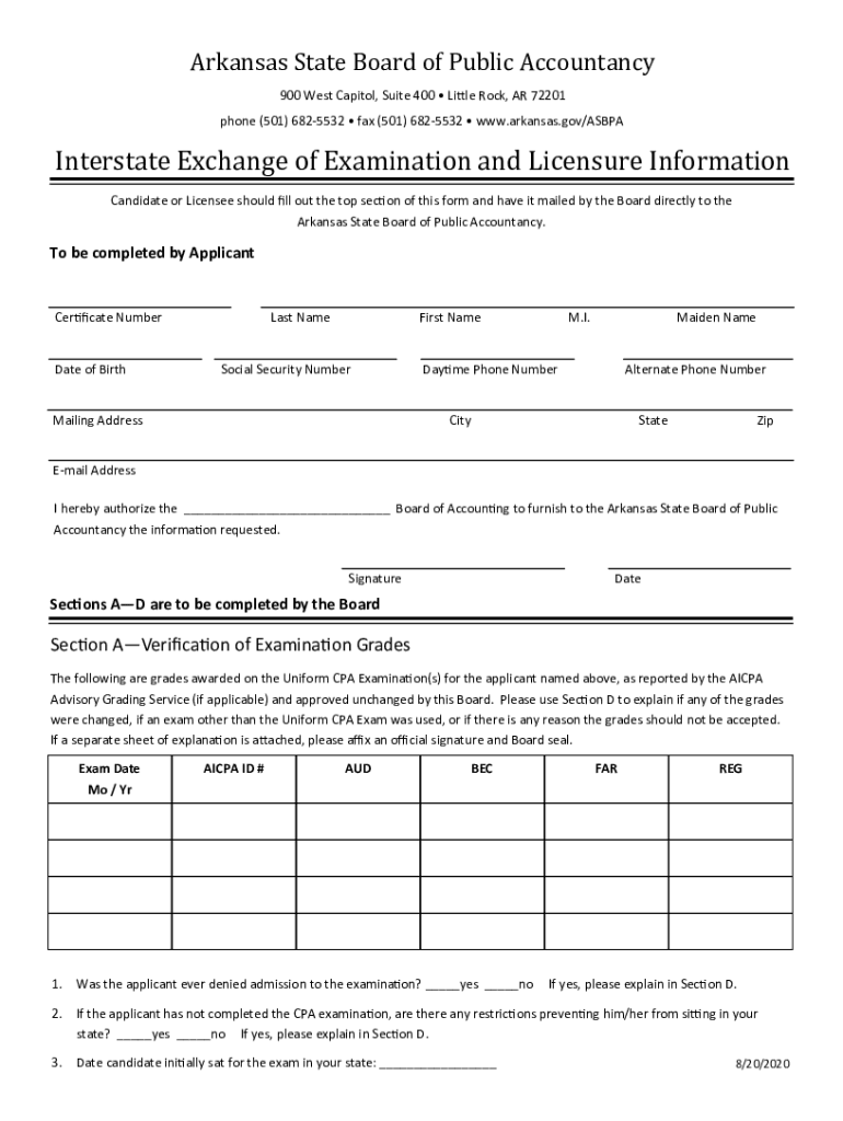Arkansas State Board of Public Accountancy900 West Capitol, Suite 400 Li LE Rock, AR 72201 phone (501) 6825532 fax (501) 6825532 www.arkansas.gov/ASBPAInterstate Exchange of Examination and Licensure