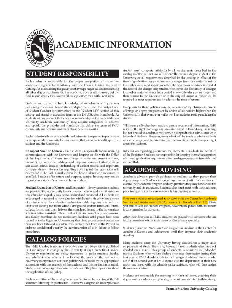 ACADEMIC INFORMATION STUDENT RESPONSIBILITY Each student is responsible for the proper completion of his or her academic program, for familiarity with the Francis Marion University Catalog, for maintaining