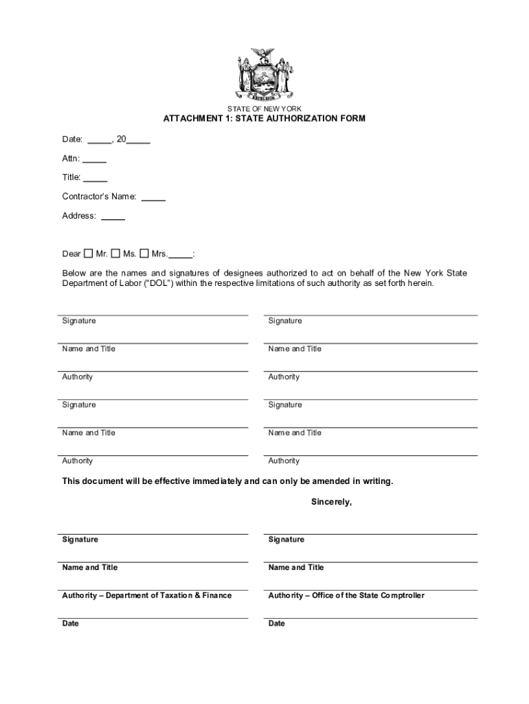 STATE OF NEW REATTACHMENT 1: STATE AUTHORIZATION FORM Date:, 20Attn: Title: Contractors Name: Address:Dearer. Ms. Mrs.:Below are the names and signatures of designees authorized to act on behalf of