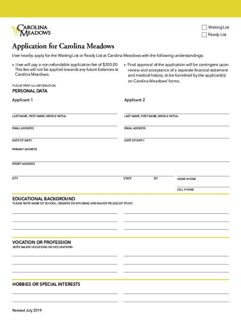 Waiting List Ready Misapplication for Carolina Meadows I/we hereby apply for the Waiting List or Ready List at Carolina Meadows with the following understandings:. I/we will pay a nonrefundable application