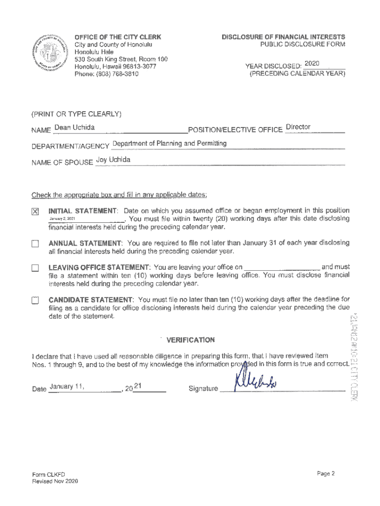 ___ ___DISCLOSURE OF FINANCIAL INTERESTSOFFICE OF THE CITY CLERKPUBLIC DISCLOSURE Ferocity and County of Honolulu Hale 530 South King Street, Room 100 Honolulu, Hawaii 968133077 Phone: (808) 7683810YEAR