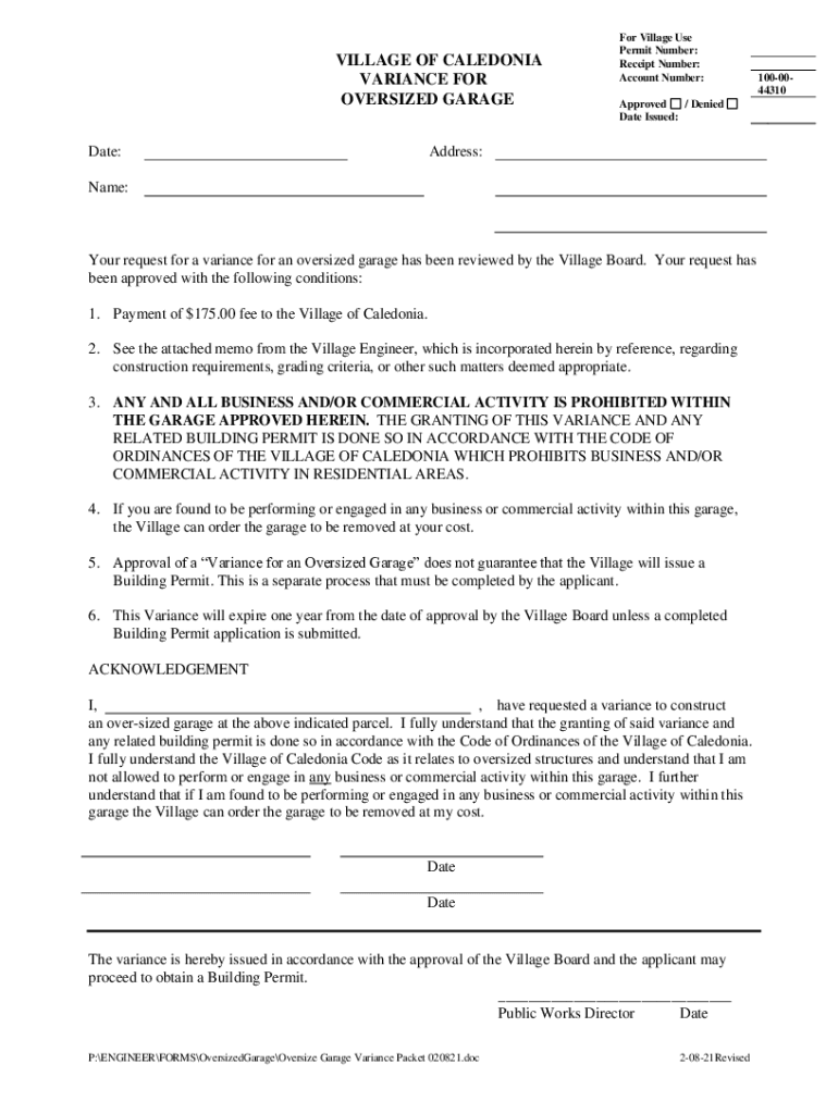 VILLAGE OF CALEDONIA VARIANCE FOR OVERSIZED GARAGE Date:For Village Use Permit Number: Receipt Number: Account Number: Approved / Denied Date Issued:Address:Name:Your request for a variance for an