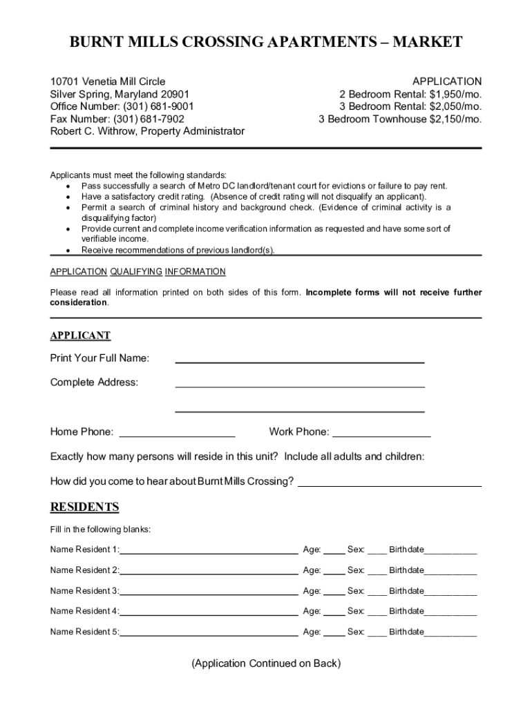 BURNT MILLS CROSSING APARTMENTS MARKET 10701 Venetian Mill Circle Silver Spring, Maryland 20901 Office Number: (301) 6819001 Fax Number: (301) 6817902 Robert C. With row, Property AdministratorAPPLICATION
