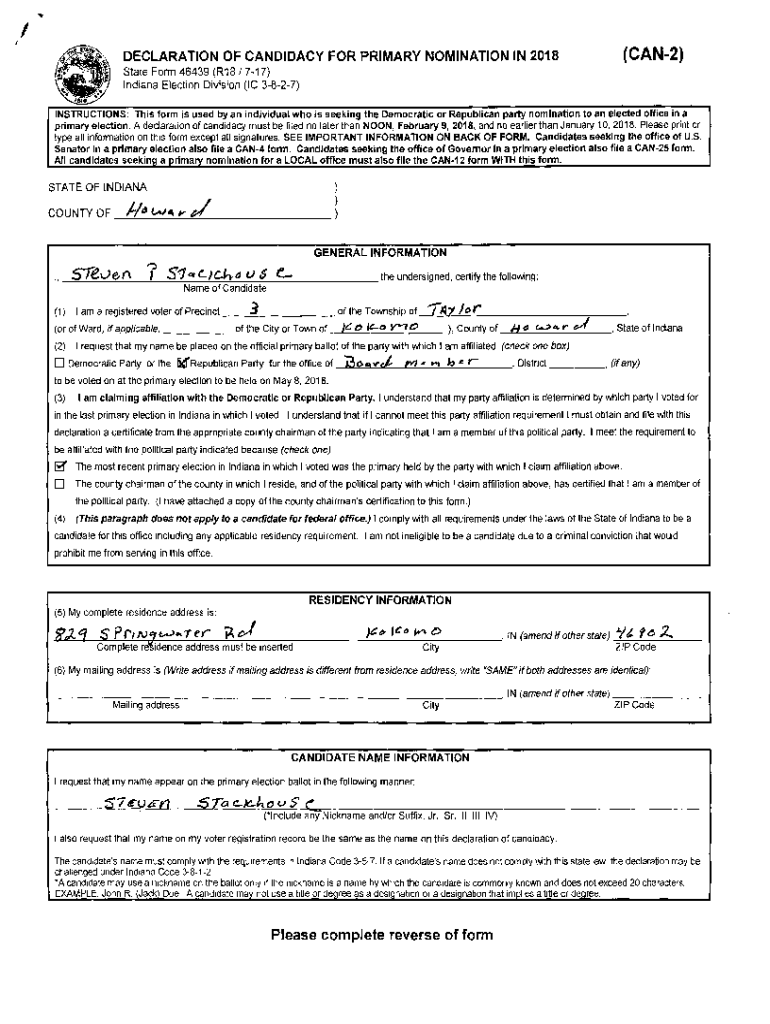 I\”\'(CAN2)DECLARATION OF CANDIDACY FOR PRIMARY NOMINATION IN 2018 State Form 46439 (R18 / 717) Indiana Election Division (IC 3827)INSTRUCTIONS: This form is used by an individual who is seeking