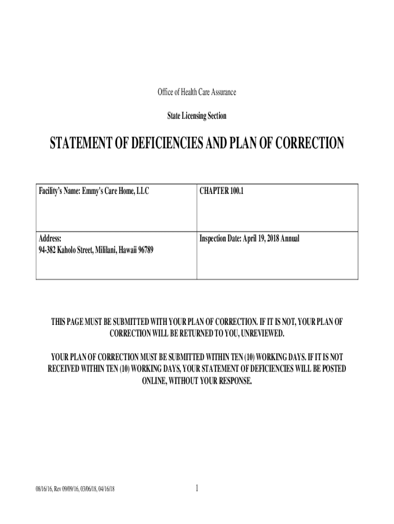 Office of Health Care Assurance State Licensing SectionSTATEMENT OF DEFICIENCIES AND PLAN OF CORRECTION Facilities Name: Emmy\'s Care Home, CHAPTER 100.1Address: 94382 Keyhole Street, Militant, Hawaii