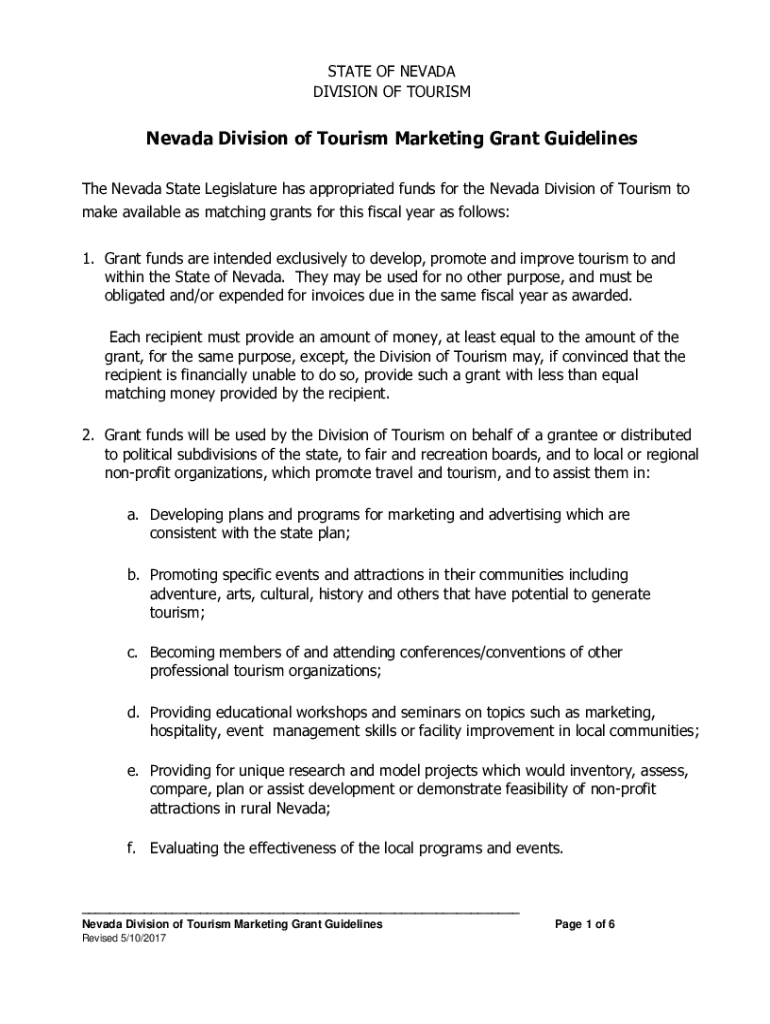 STATE OF NEVADA DIVISION OF TOURISM Nevada Division of Tourism Marketing Grant Guidelines The Nevada State Legislature has appropriated funds for the Nevada Division of Tourism to make available as