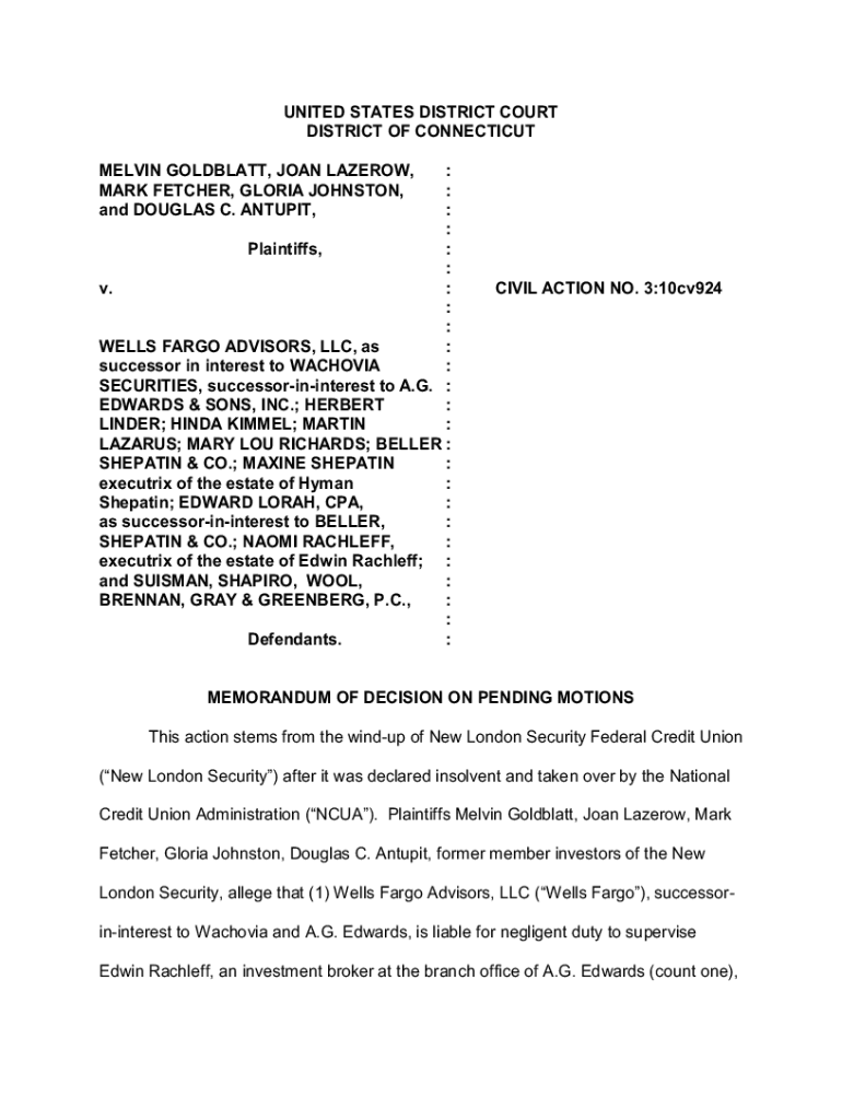 UNITED STATES DISTRICT COURT DISTRICT OF CONNECTICUT MELVIN GOLDBLUM, JOAN LAZARO, MARK FETCHER, GLORIA JOHNSTON, and DOUGLAS C. INTUIT, : : : : Plaintiffs, : : v. : : : WELLS FARGO ADVISORS, LLC,