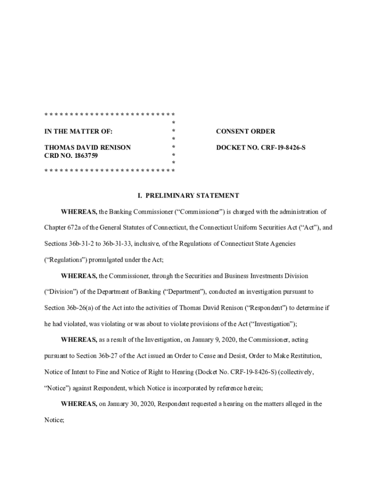 Get the free www.business.ct.govRenison-Thomas-James-COIN THE MATTER OF: * CONSEN