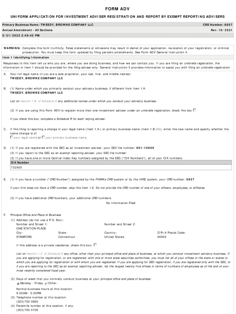 FORM ADV UNIFORM APPLICATION FOR INVESTMENT ADVISER REGISTRATION AND REPORT BY EXEMPT REPORTING ADVISERS Primary Business Name: TWEEDY, BROWNE COMPANY LLC CRD Number: 6857Annual Amendment All Sections