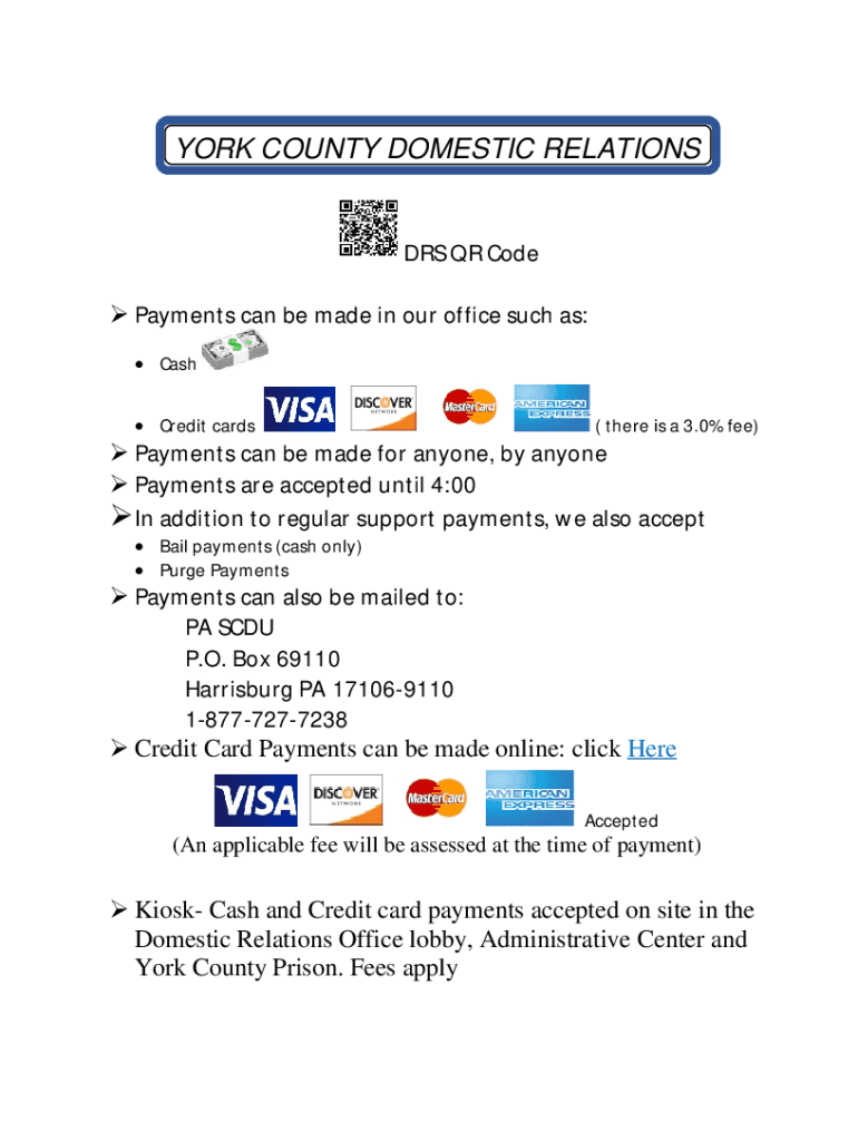 YORK COUNTY DOMESTIC RELATIONS DRS QR Code Payments can be made in our office such as: Cash Credit cards(there is a 3.0% fee) Payments can be made for anyone, by anyone Payments are accepted until
