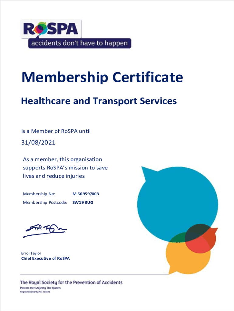 Membership Certificate Healthcare and Transport Services Is a Member of Rosa until31/08/2021 As a member, this organization supports Ross mission to save lives and reduce injuries Membership No: Date