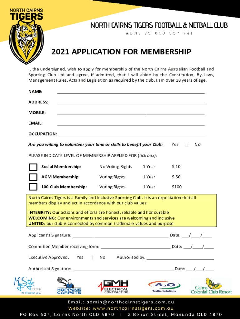 Get the free northcairnstigers.com.au wp-content uploads2021 APPLICATION FOR MEMBERSHIP - North C...