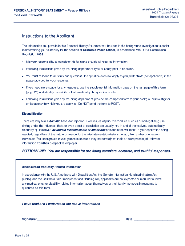 Bakersfield Police Department 1601 Trust Avenue Bakersfield CA 93301PERSONAL HISTORY STATEMENT Peace Officer POST 2251 (Rev 02/2018)Instructions to the Applicant The information you provide in this